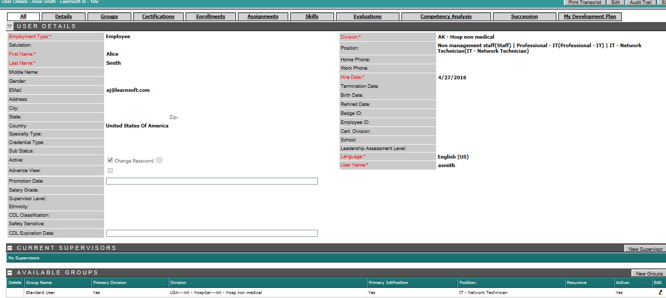 Generally, Users are created automatically as part of the daily User Import Service where the latest organizational HR / ERP data is imported into the LMS system. Administrators, however, do have the capability of adding and editing User information directly, assigning groups and enrolling users in courses.