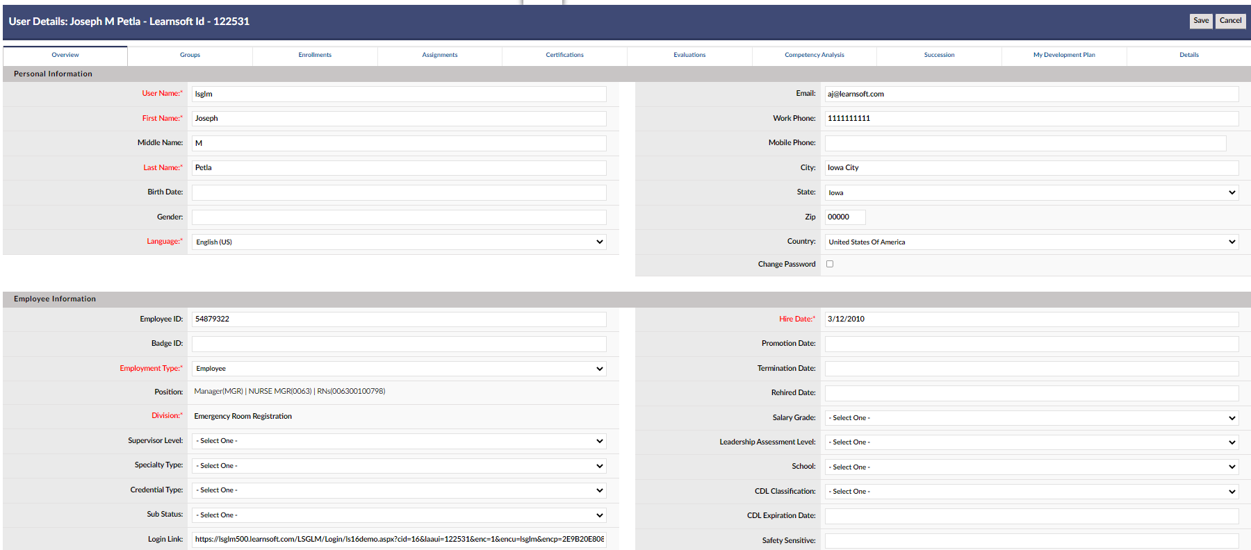 - Email: (Recommended) Email address associated with the selected record. This field is used to send reminders to the user and confirm LMS activities.